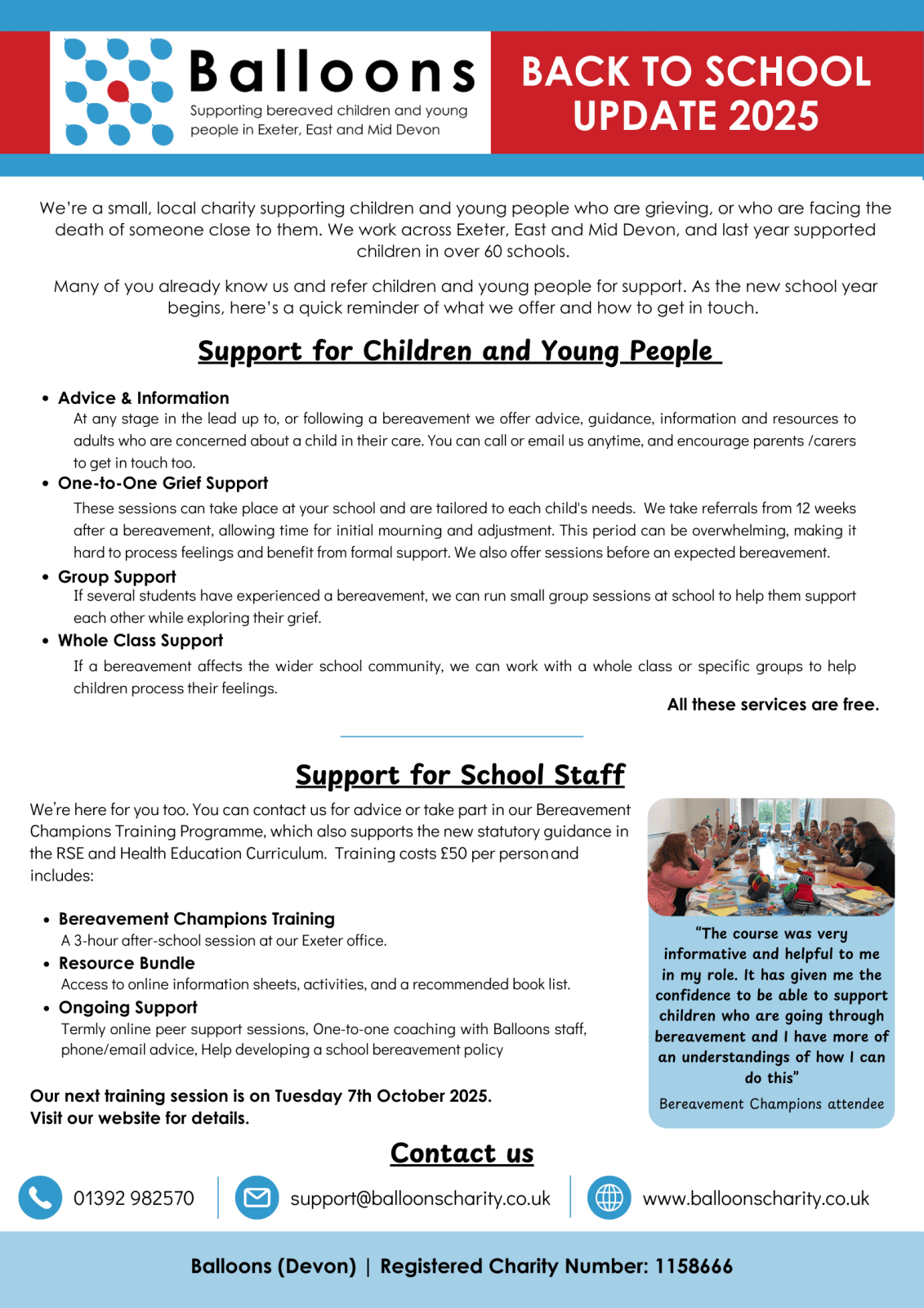 We appreciate that conversations around bereavement can be very difficult at any age and we are here to support professionals in delivering the health and wellbeing curriculum. If you or any staff at your school need advice or training, please do contact us at support@balloonscharity.co.uk.